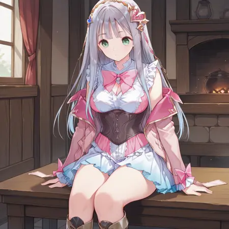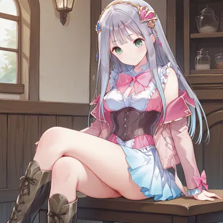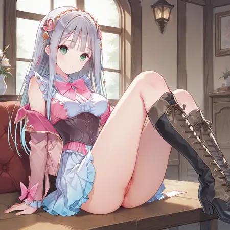 luluya,long hair, bangs, skirt, hair ornament, long sleeves, bow, green eyes, jacket, grey hair, boots, frills, bowtie, knee boots, pink bow, corset, gradient hair,