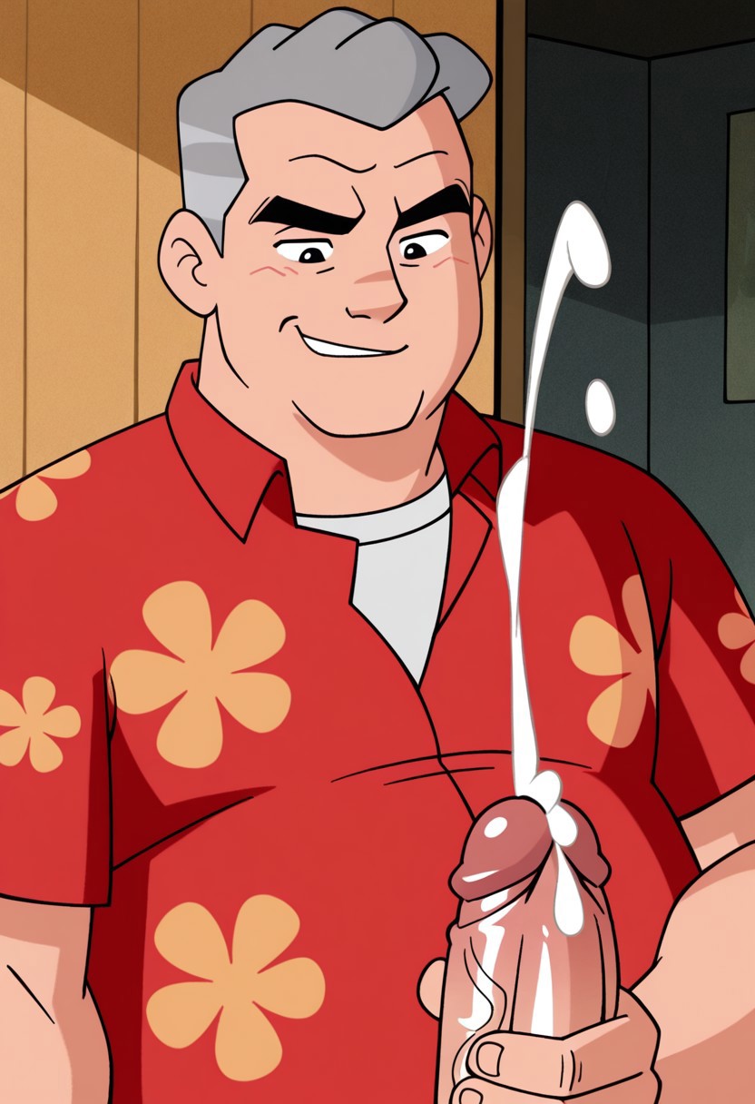 맥스 테니슨, 1소년, 혼자, 회색 헤어, 단발, 검은 눈, 칼라가 있는 빨간 셔츠, 단소매, 빨간 하와이안 셔츠, 플로럴 프린트, 통통한, 파란 바지, 상체