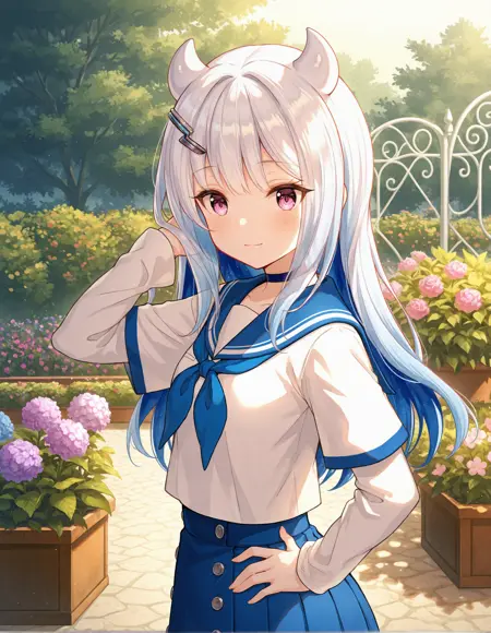 カジュアル装: mgrceternalsakura, etscsl, 白髪, 青内毛, 銀髪留め, 濃紺のチョーカー, 白シャツ, 青いセーラーカラー, 青いネックレス, 短い上に長い袖, 青いプリーツスカート, 白いパンティストッキング