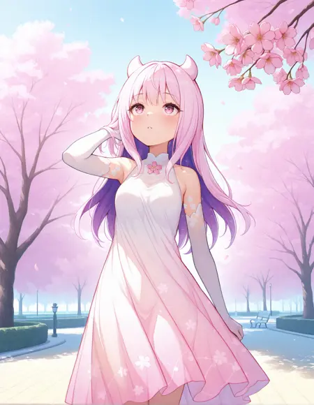 伝説装: mgrceternalsakura, etsuws, 淡ピンク髪, 紫内毛, グラデーションのノースリーブドレス, ピンクの胸元の花, 白いエルボーグローブ