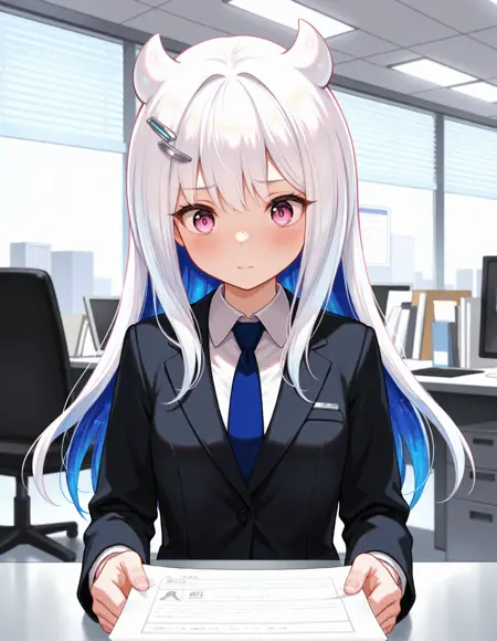 魔法少女装: mgrceternalsakura, etsmgc, 白髪, 青内毛, 銀髪留め, 濃紺のチョーカー, 白トップス, 銀色の胸飾り, 白い取り外し可能な袖, 袖のカットアウト, 銀色のブレスレット, 濃紺のハイウエストスカート, スカートのカットアウト