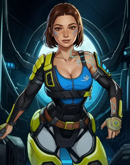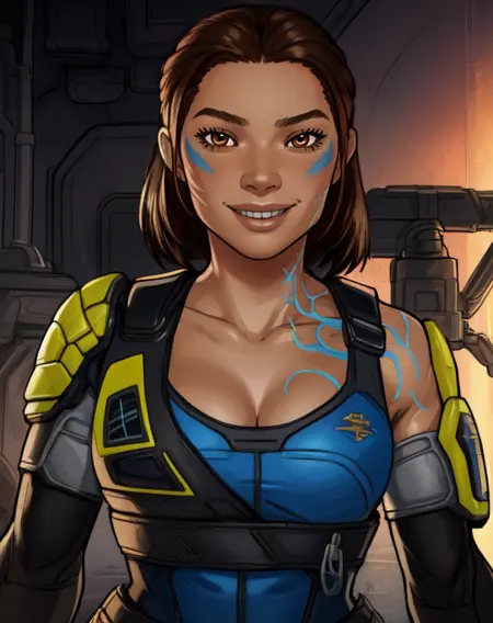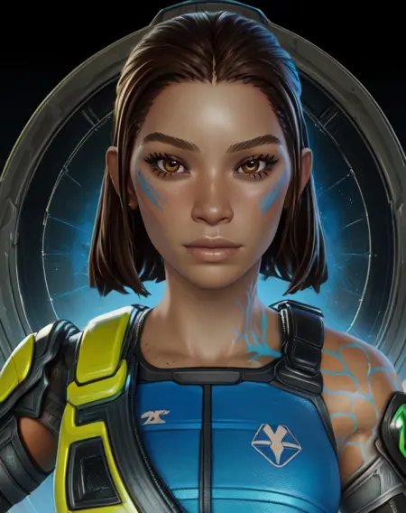 conduit, brown hair, brown eyes, - facial mark, shoulder tattoo,
