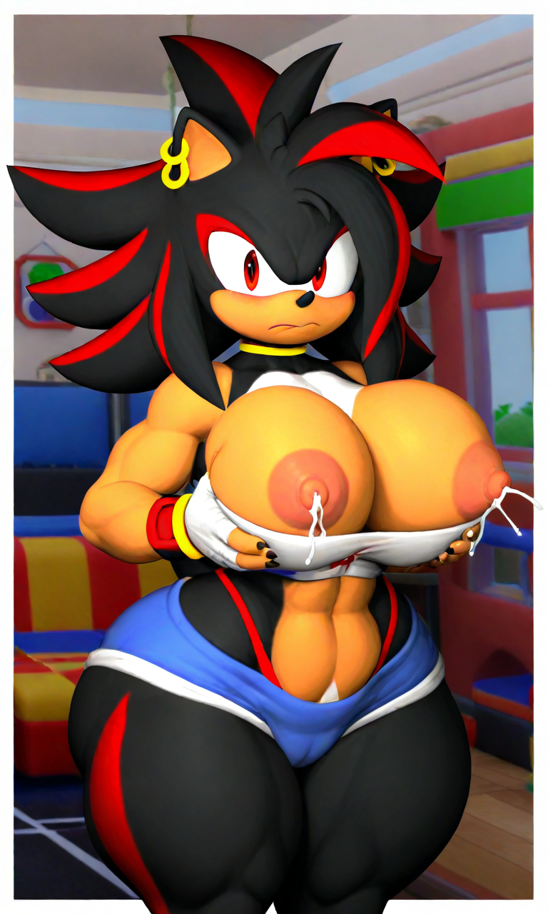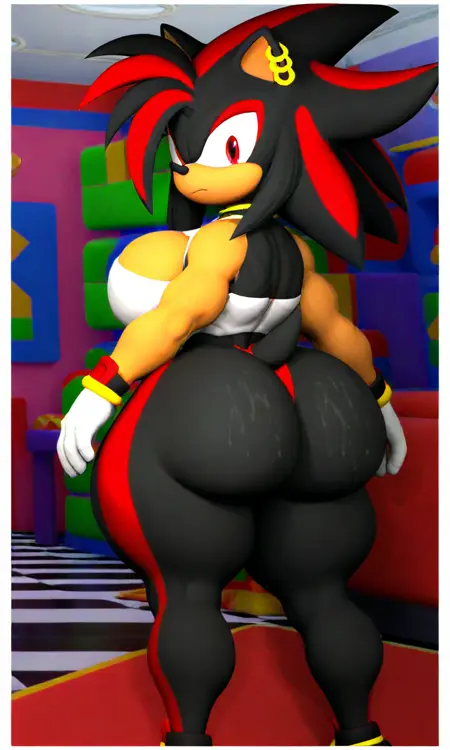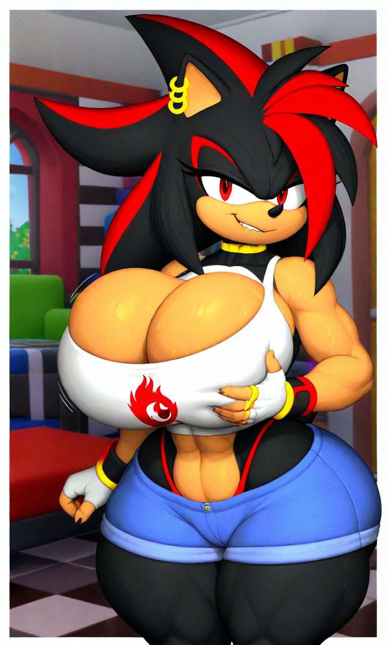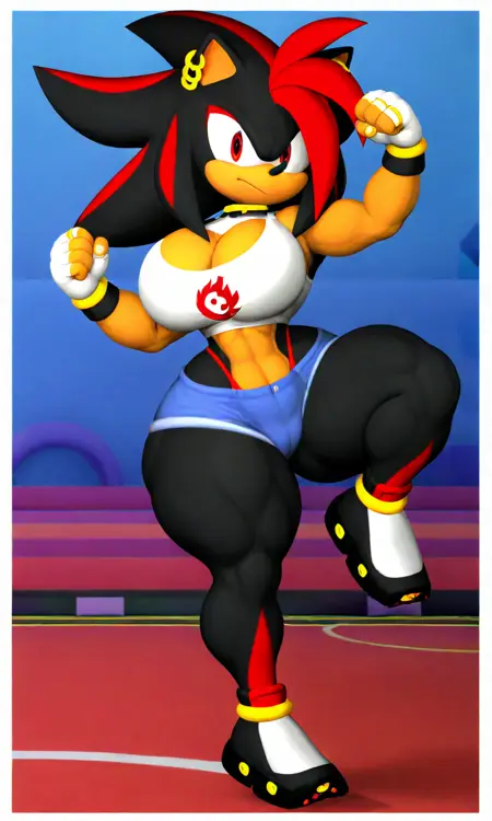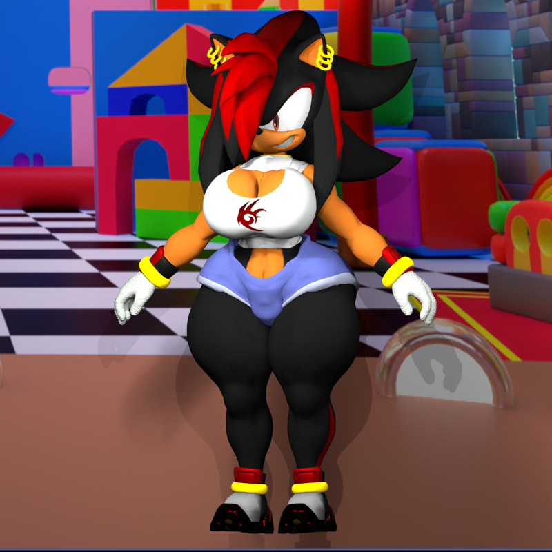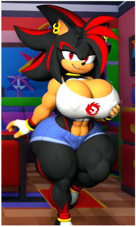 标签:KM_femshadow, 黑红毛发, 刺猬, 红眼, 红发, 黑发, 双色发, 耳环, 白色短上衣, 红色丁字裤, 蓝色短裤, 黄色项圈, 绿色宝石, 白色手套, 手腕环, 鞋子