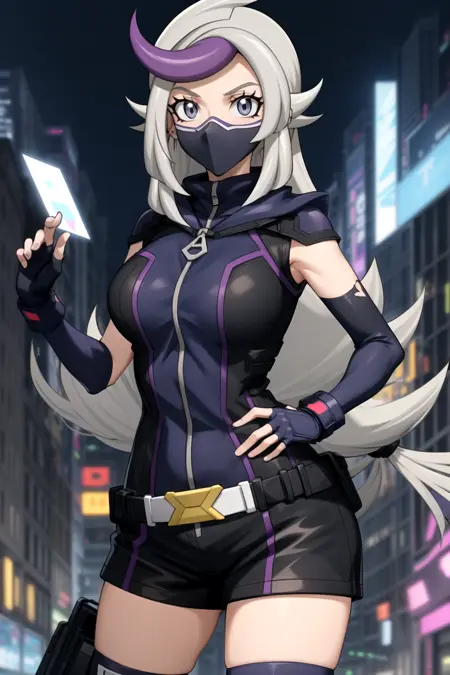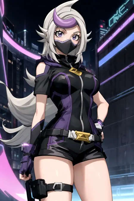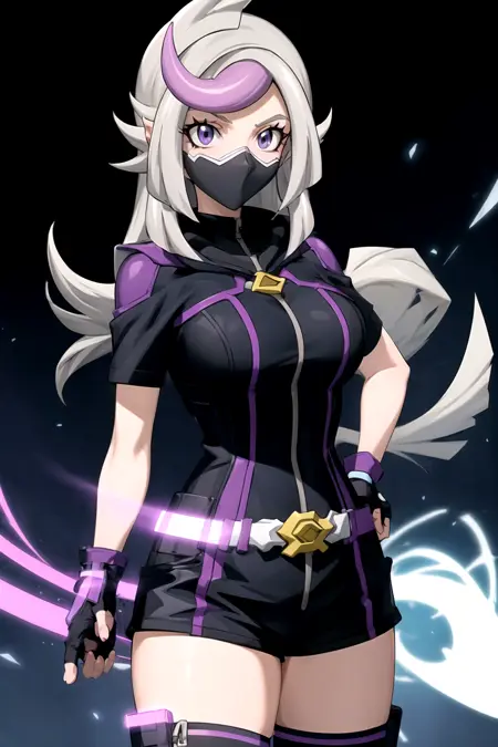 ghost_girl_: Ghost Girl/Gal로서의 전체 외모를 얻기 위해 사용. 회색 머리, 보라색 머리 및 **회색 눈**과 함께 사용하며, 주요 옷차림으로는 **보라색 및 흰색 바디수트, 짧은 소매, 검은 반바지, 짧은 반바지, 벨트, 부츠, 보라색 허벅지 양말, 보라색 장갑, 핑거레스 장갑**을 사용하며, 선택 사항으로 마지막에 **마스크**를 추가. 또한 부정적 프롬프트에 **emma_bessho**와 **분홍색 머리**를 포함시킬 것.