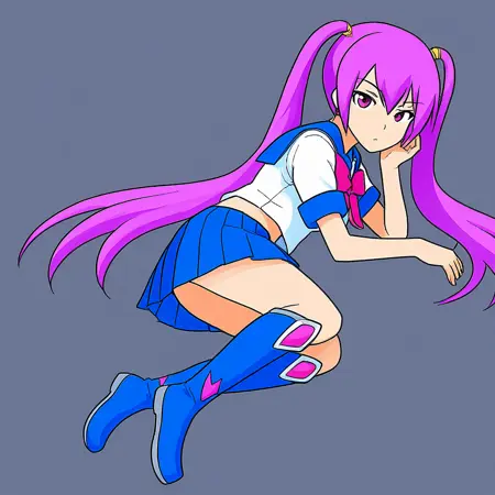 1소녀, 혼자, 보라색 머리, 트윈테일, 긴 머리, 학교 유니폼, 무릎까지 오는 부츠,