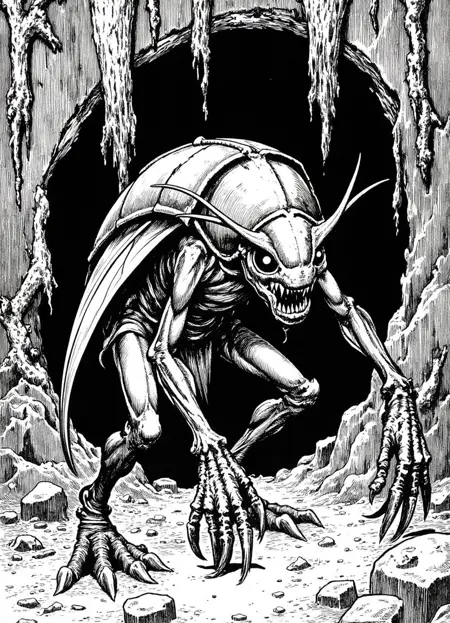 흑백 / 잉크 드로잉: 펜과 잉크, 혹은 연필로 그린 선들이 풍부하며, 강한 대비와 깊이 및 질감을 위한 무거운 교차 선이 특징입니다.