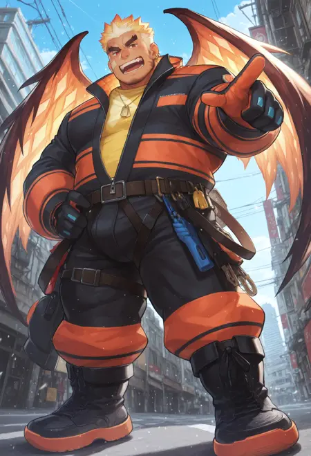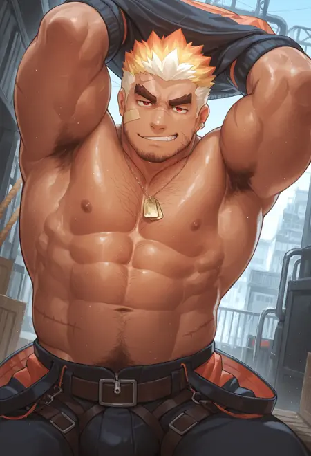 tan skin, two-tone hair, spiked hair, orange hair, blonde hair, red eyes, thick eyebrows, forked eyebrows, beard stubble, facial hair, scar, scar on face, bandaid, bandaid on face, muscular male, strongman waist, sparse chest hair, body hair