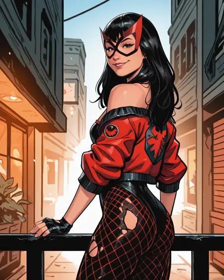 트리거: redcanary, 검은 머리, 검은 눈, 손가락 없는 장갑, 피시넷, 팬티홀스, 레오타드, 빨간 재킷, 찢어진 옷, 마스크