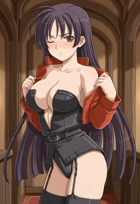 开襟夹克,红色夹克,短款夹克,锁骨,胸脯,黑色衬衫,敞开的衬衫,腰带,黑色紧身衣,吊袜带,黑色过膝长筒袜,