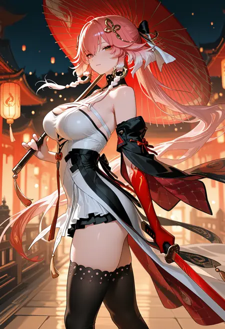Optional: holding sword / flame sword, holding parasol, falling maple leaves / maple leaves, lanterns, dynamic pose, flames