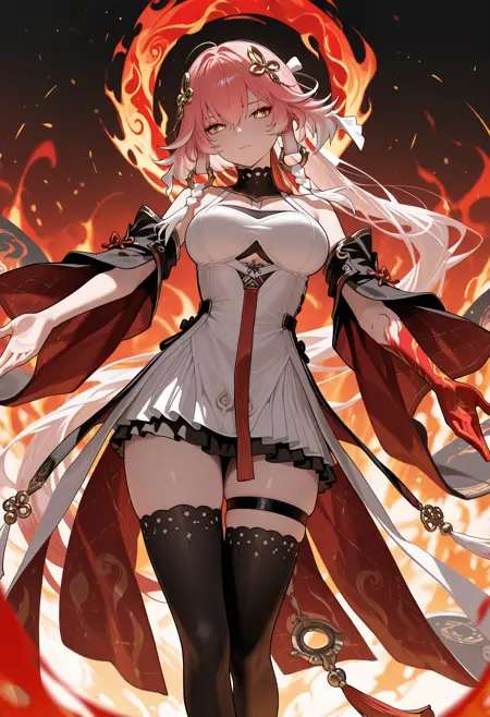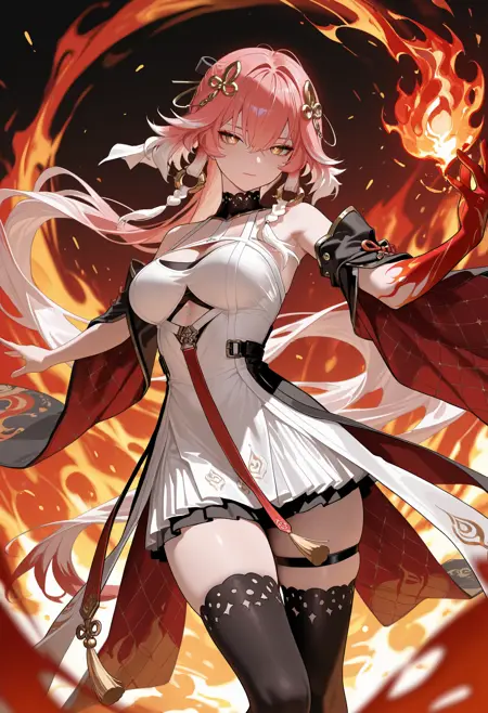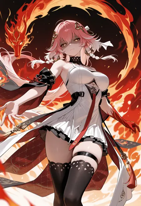 Default outfit: white sleeveless dress, black choker with gold trim, black detached sleeves with red lining, red ribbon belt, black thighhighs with cutout pattern, black high heels, long black and white sash, gold tassels, red inner lining with diamond pattern, gold hair ornaments (gold hair ornaments often end up on Changli's head even if you don't specify it, so if you want a shot without them, I suggest adding it to the negatives)