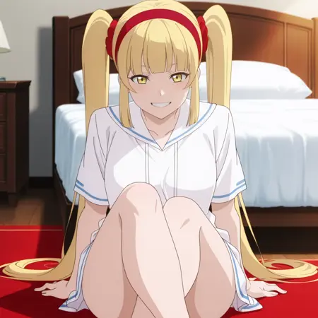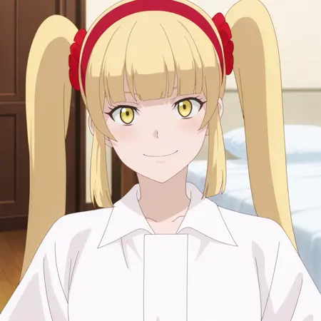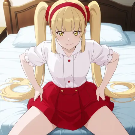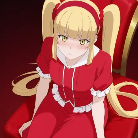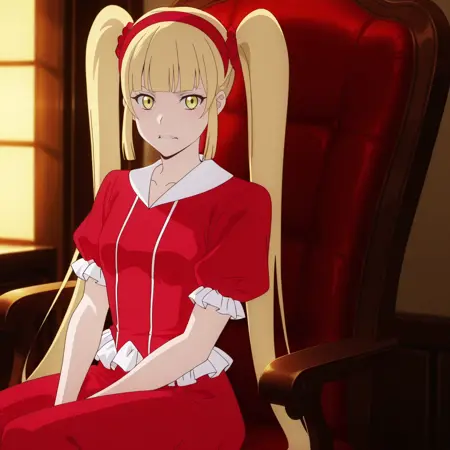 ReMonsterRubiria,黄眼睛,金发,齐刘海,侧发,极长发,双马尾,红色发带,红色发圈,