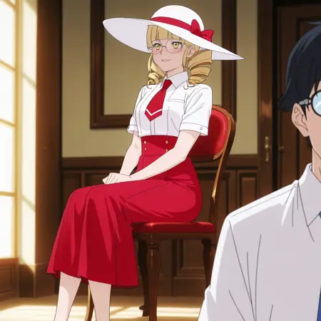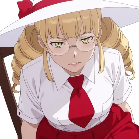 ReMonsterRubiriaUndercover,螺旋发,双螺旋发,白帽,遮阳帽,红色丝带,红裙,白衬衫,有领衬衫,短袖,眼镜,领带,圆形眼镜,