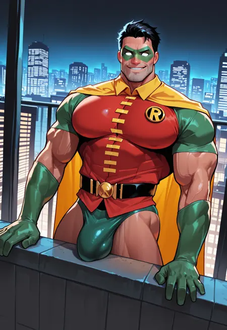 이것은 배트맨입니다. 특정 버전이나 스타일은 아니고, 제가 좋아하는 이 고전적인 복장과 나이트윙 복장 버전, 그리고 고전적인 로빈 복장으로 된 좀 우스운 버전입니다.