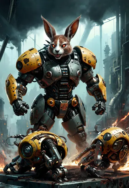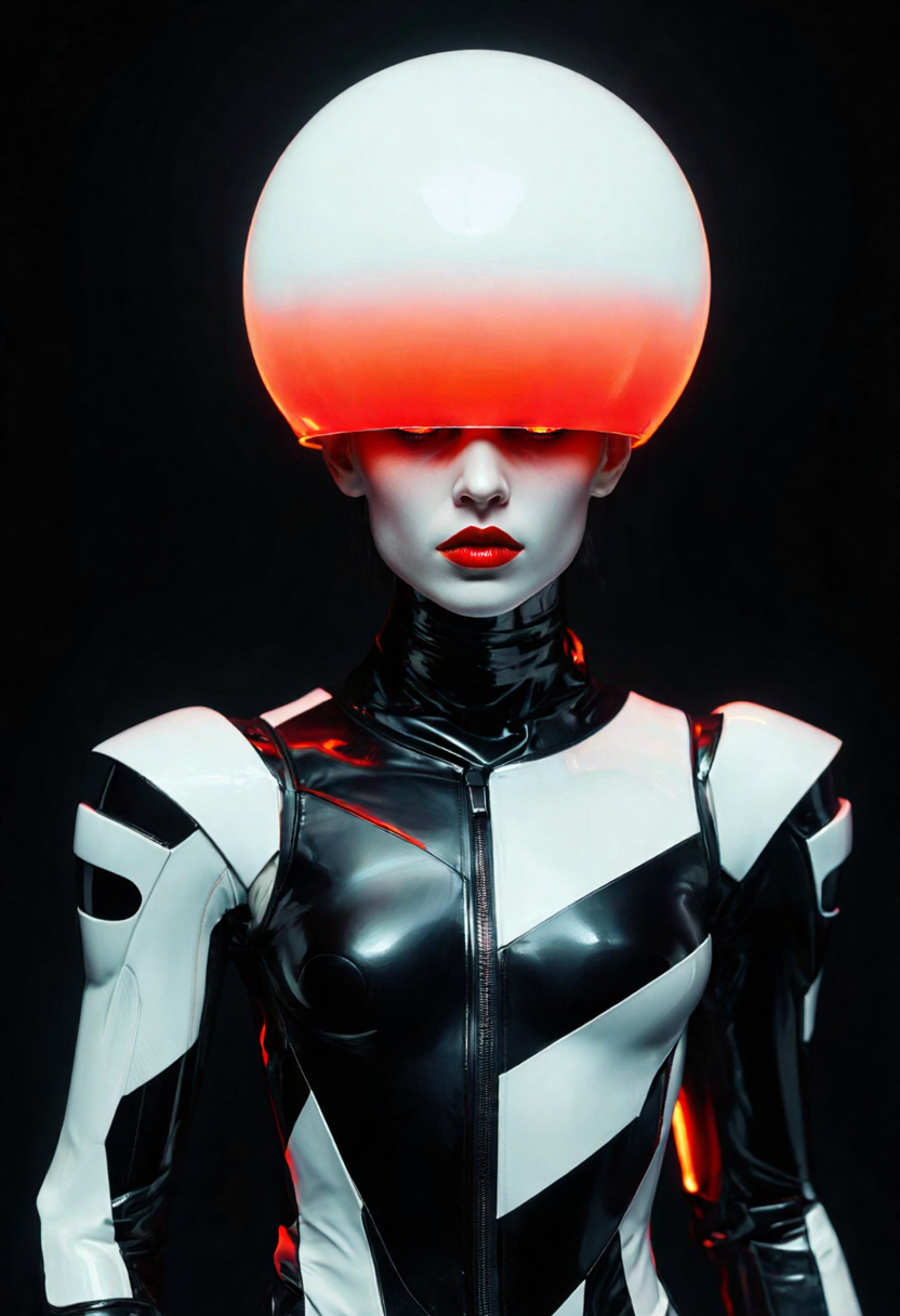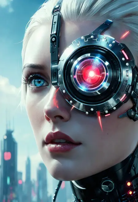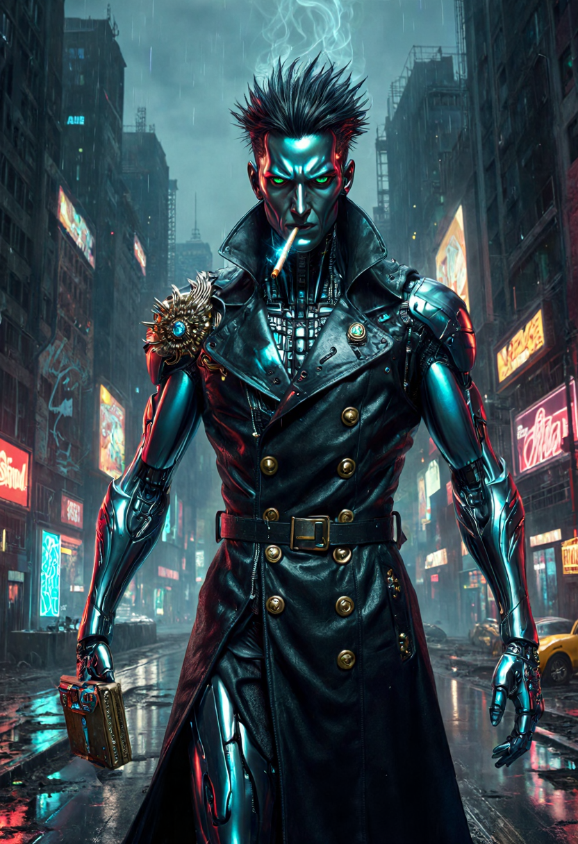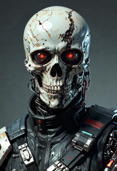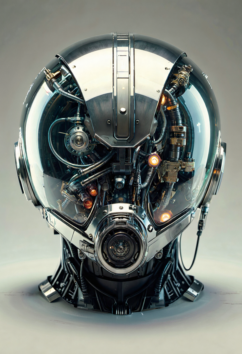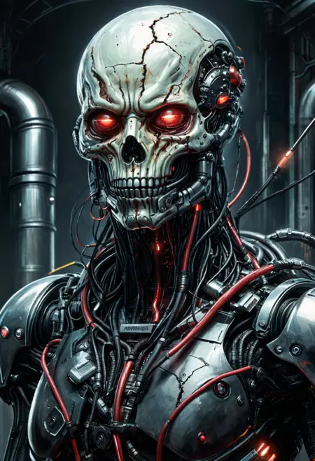 없음. “크롬 도금 외골격,” “바이오메카니컬,” “사이버네틱 두개골,” “발광 바이저,” “산업용 항만,” “스파크와 잿불,” 또는 “네온 배경조명” 같은 문구로 유도하세요.