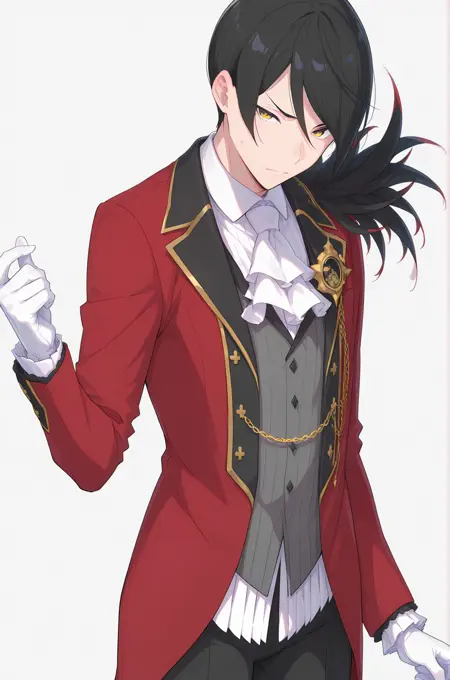 VincentVollachia-Liver020, 1boy, 1man, male focus, solo, black hair, red eyes,short hair,bangs,ornaments, red coat, long coat, tailcoat, aristocrat coat, embroidered coat, gold trim, coat lining, gray vest, black vest, waistcoat, layered vest, white shirt, high collar shirt, cravat, frilled cravat, white gloves, formal gloves, brooch, ornamental brooch, emblem brooch, medallion, chain accessory, gold chain, single epaulette, epaulette, shoulder ornament, aiguillette, formal attire, aristocrat, noble clothing, elegant clothes, black pants, tailored pants,