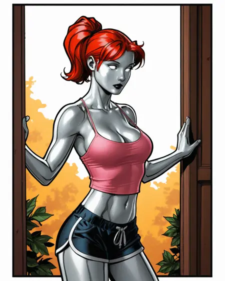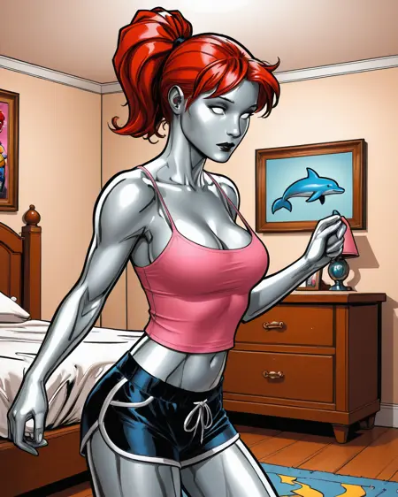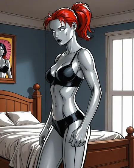트리거: mercuryxmen, 색소가 있는 피부, 빨간 머리, 말뚝머리, 하얀 눈, 동공 없음, 크롭탑, 복부, 바지