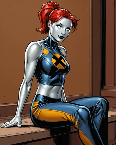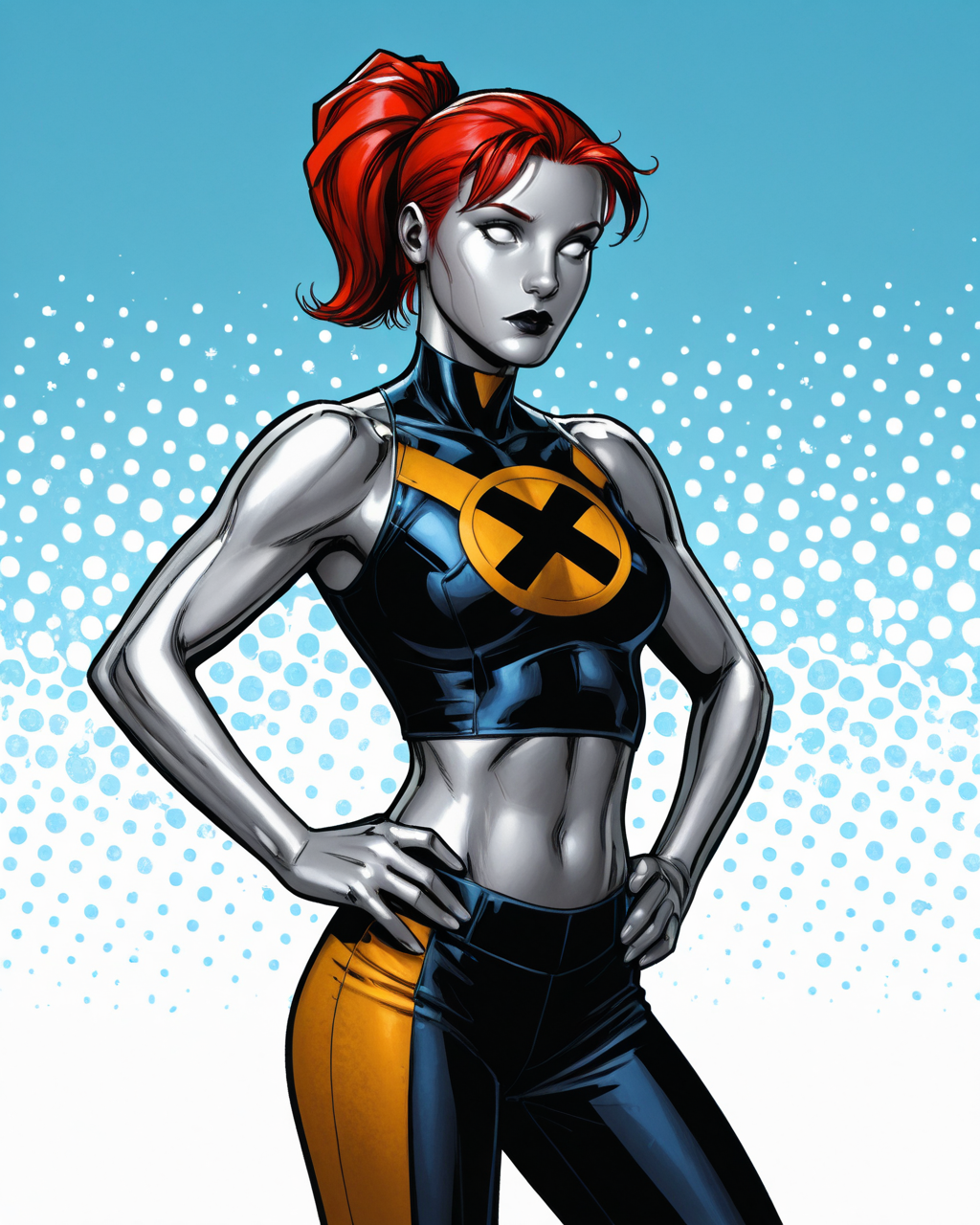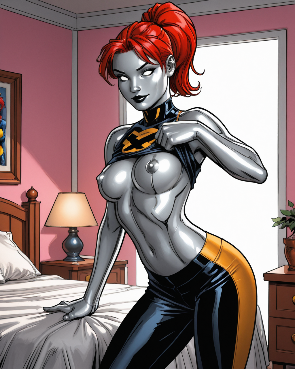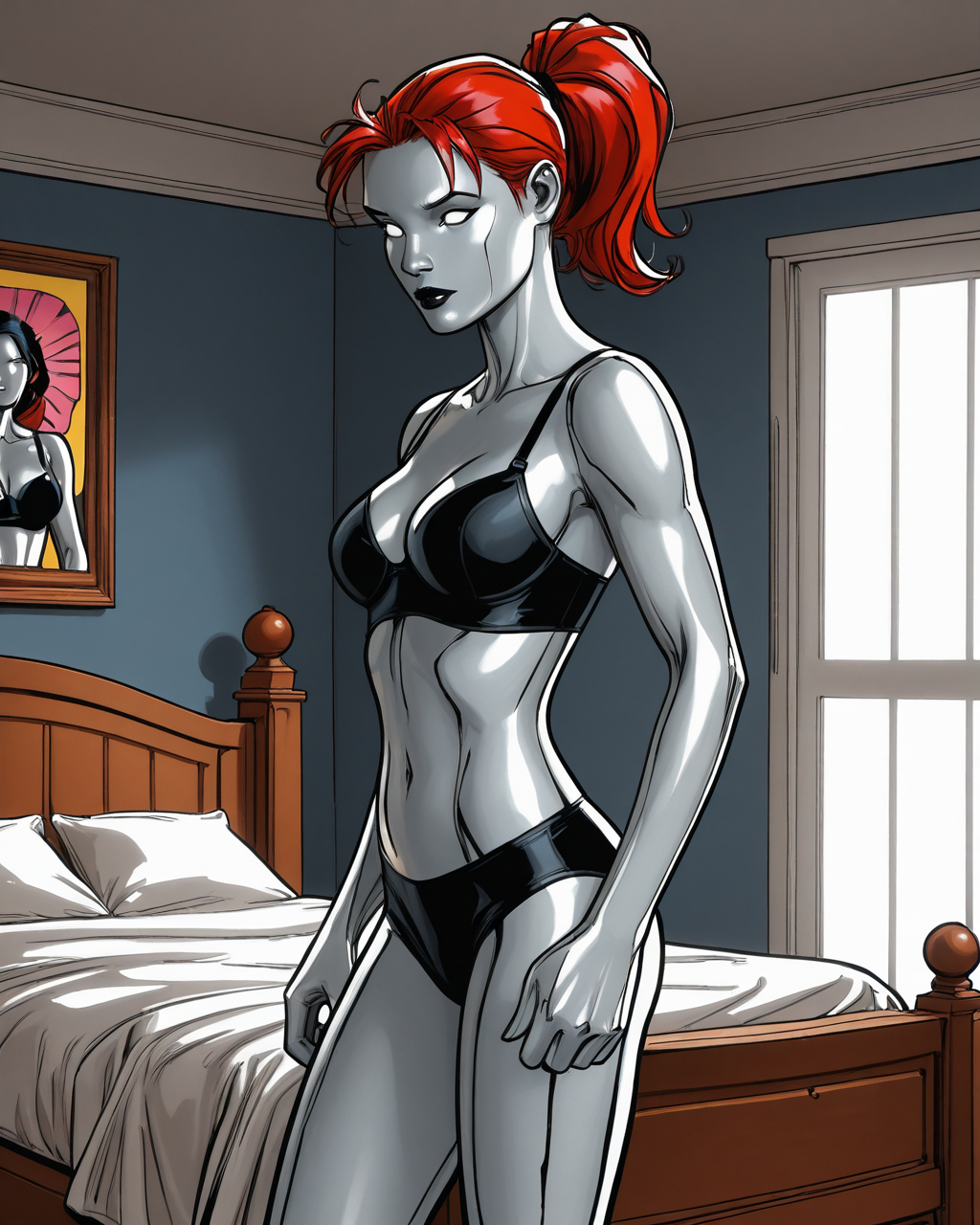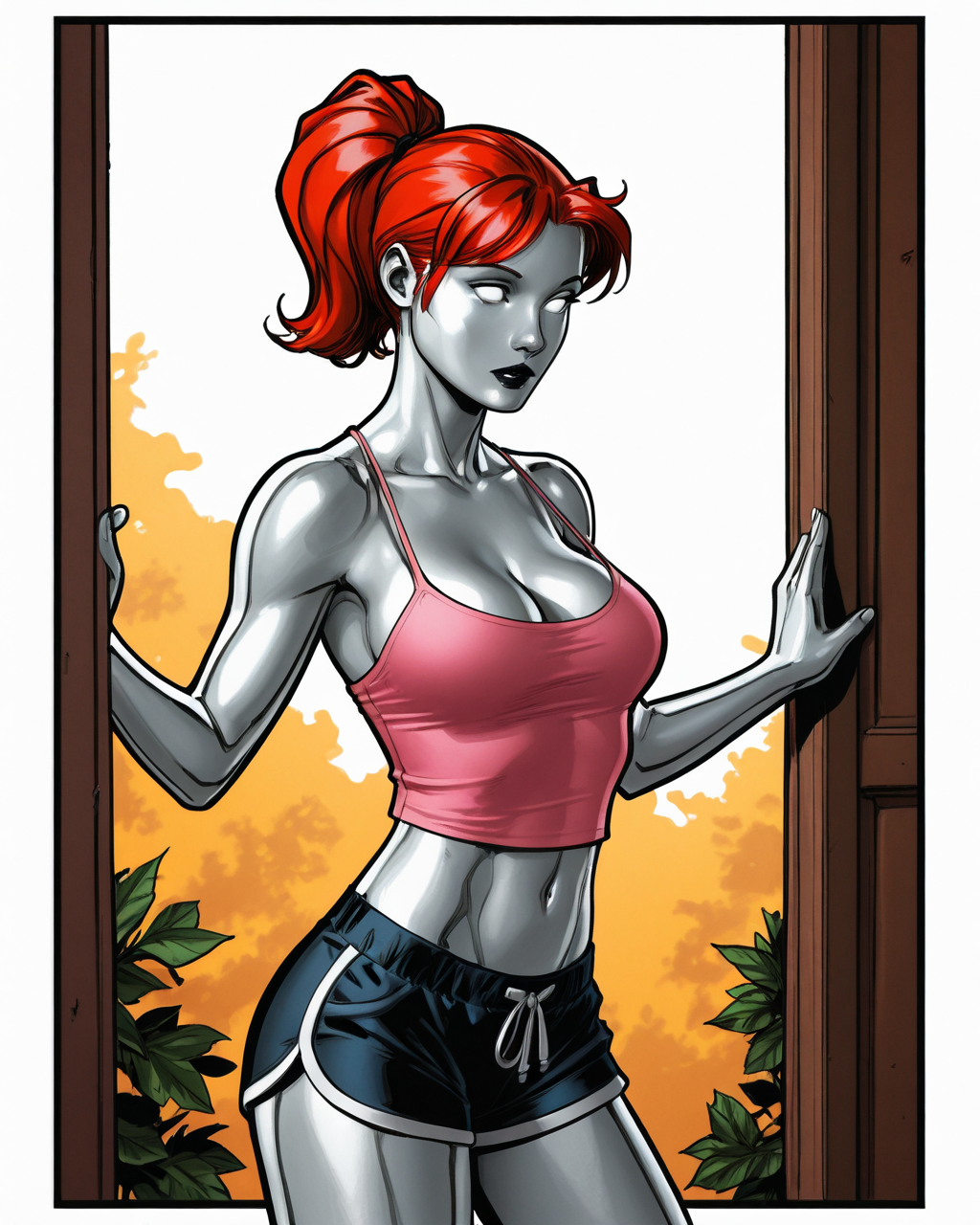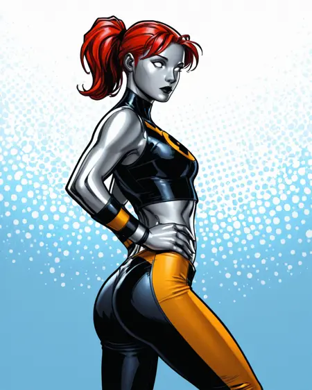 トリガー: mercuryxmen, 色付きの肌, 赤髪, ポニーテール, 白い目, 瞳なし, クロップトップ, お腹の露出, パンツ
