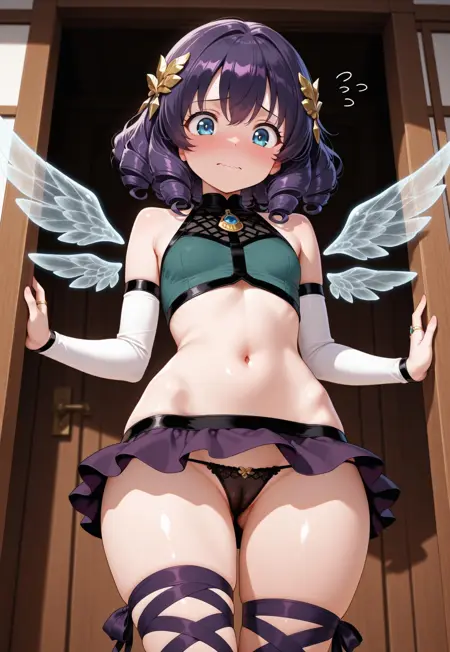 | 训练词汇 | white detached sleeves, cyan transparent wings, brown toeless boots, ring, gold hair ornament, dark purple miniskirt, standing, green crop top, leg ribbon, dark purple hair, big butt,, embarrassed face, wavy mouth, solo, pretty, cute, petite, curly locks, dark blue eyes, midriff, pronounced hip bones, lowleg skirt, wide hips已复制! |