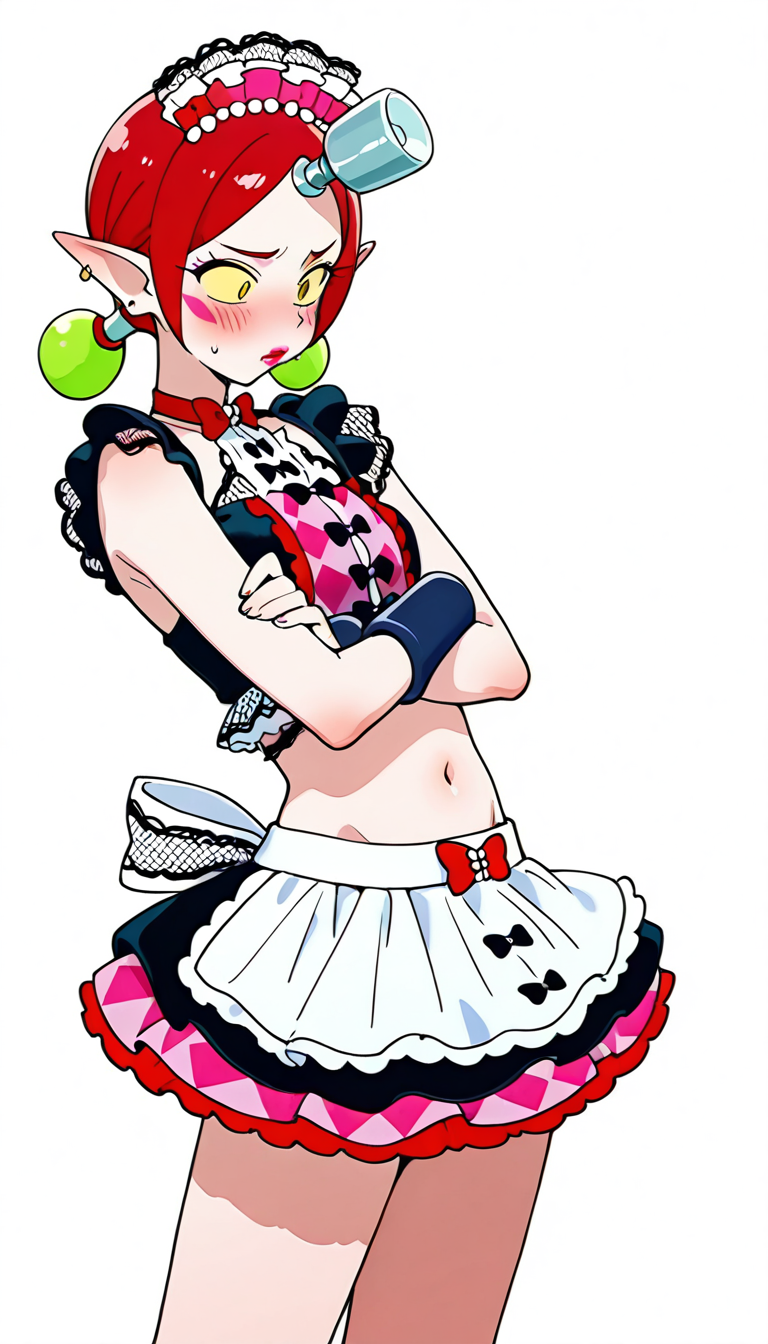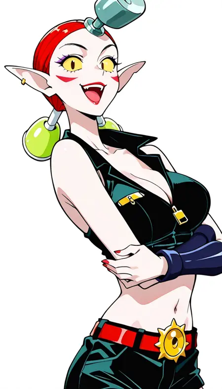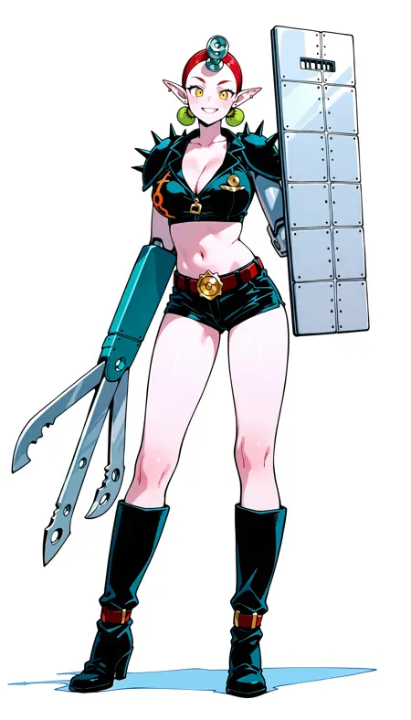 | 训练词汇 | doorknobder, 1girl, solo, breasts, navel, jewelry, full body, red hair, earrings, boots, shorts, pointy ears, midriff, belt, crop top, shield, doorknob on forehead, short shorts, shoulder spikes, shoulder pads, knee boots, green hair bun, door shield, weapon, right arm weapon已复制! |