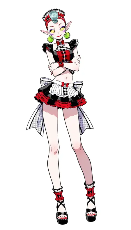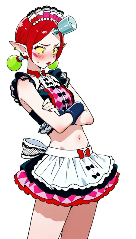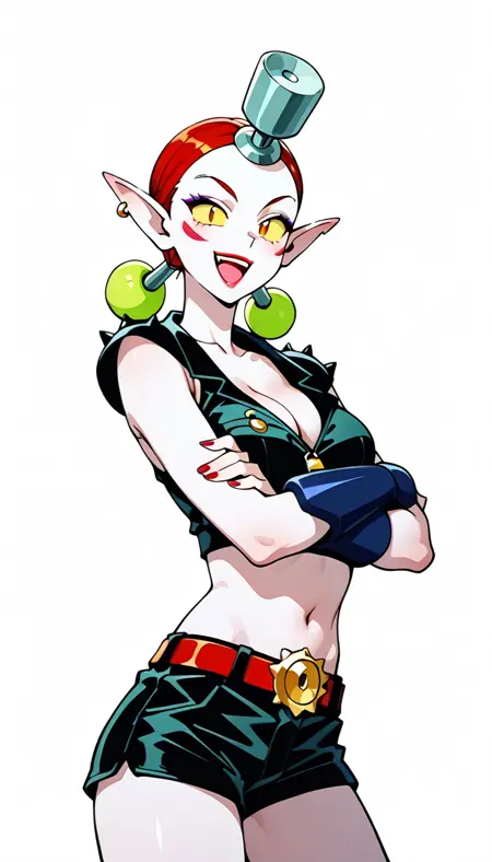 doorknobder, 1girl, solo, breasts, navel, jewelry, full body, red hair, earrings, boots, shorts, pointy ears, midriff, belt, crop top, shield, doorknob on forehead, short shorts, shoulder spikes, shoulder pads, knee boots, green hair bun, door shield, weapon, right arm weapon