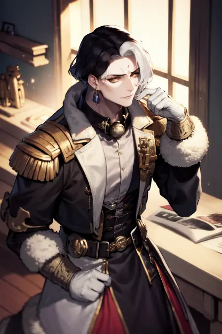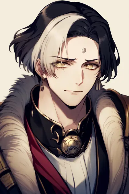 Trigger words: 1boy, solo, emet selch, white streaked hair, black hair