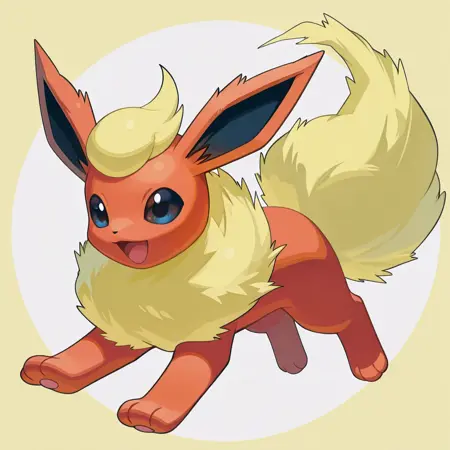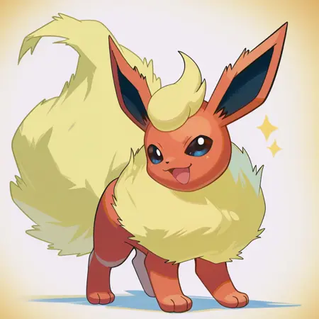 flareon, pokemon (creature), red-orange fur, light yellow tuft, light yellow mane, light yellow tail, dark eyes, quadruped