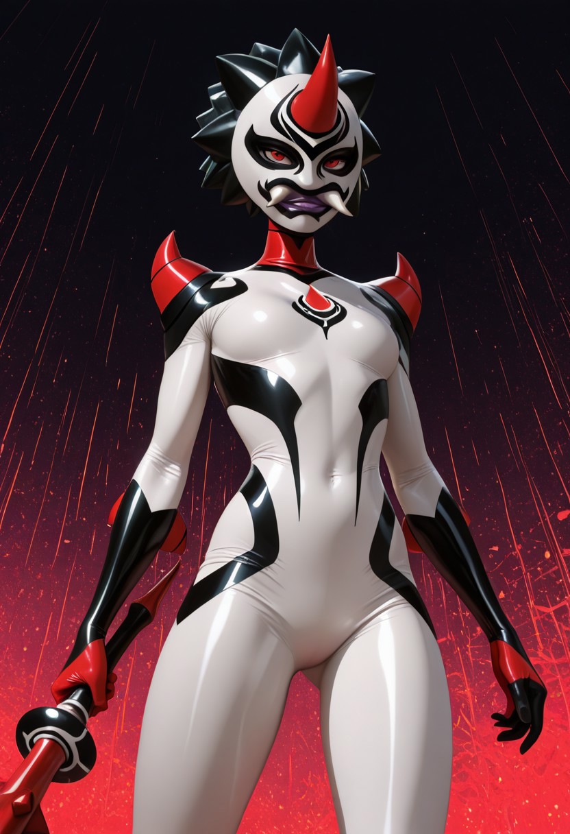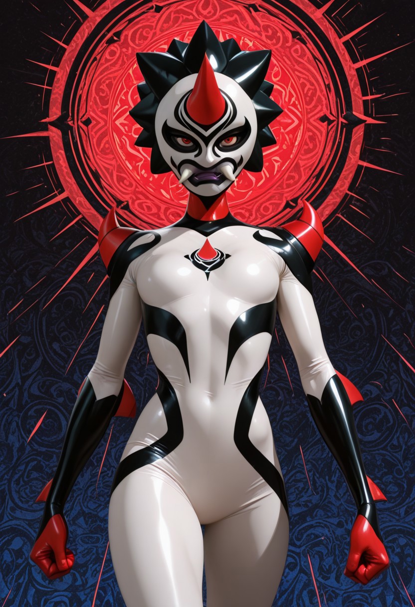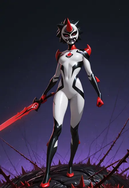 white bodysuit with black marks, skin tight, insignia on chest, black forearms, black forelegs, Red spikes, red turtleneck, red gloves, red shoes with black soles, red sword with black thorns,