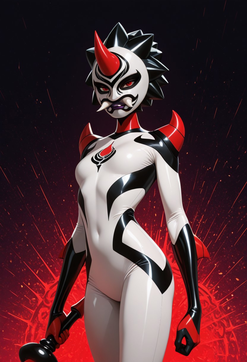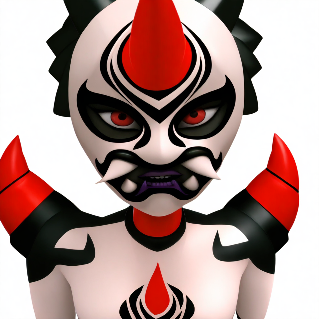 MLonichan, obsidian-black skin, colored skin, black hair, wild hair, pointy hair, red eyes, purple lipstick, mask, ogre's mask, white mask with black marks, one red horn, forehead horn, black outlined,