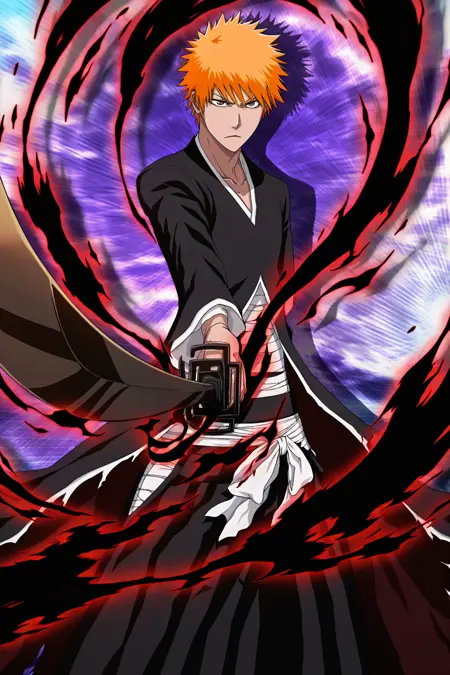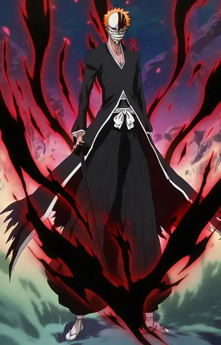 | 训练词汇 | Bankai_Ichigo, solo,short hair, long sleeves, 1boy, brown eyes,male focus, japanese clothes, sword, orange hair, orange eyes, torn clothes, black pants, holding sword, katana, spiked hair,已复制! mask, colored sclera, skull, black sclera, skull mask, black aura, red aura,已复制! |