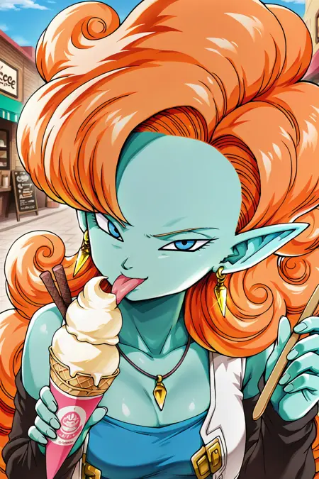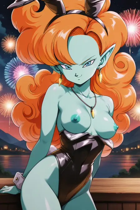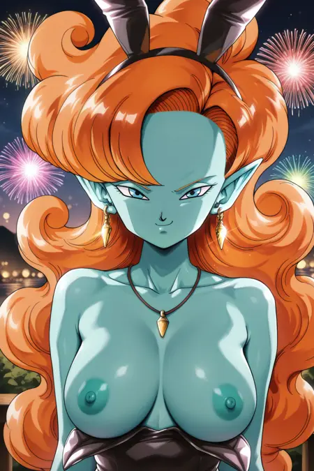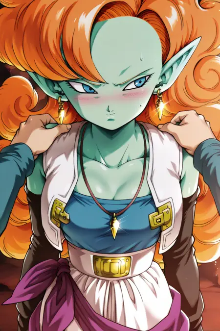 藏亚、橙色头发、卷发、长发、蓝眼睛、绿色皮肤、彩色皮肤、青绿色皮肤、尖耳朵、珠宝、项链、耳环