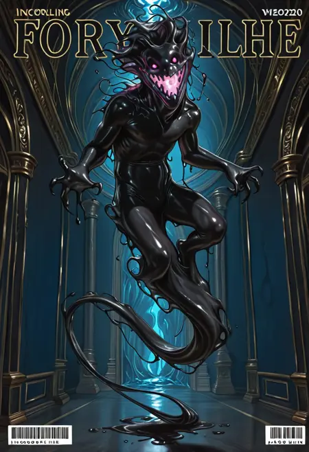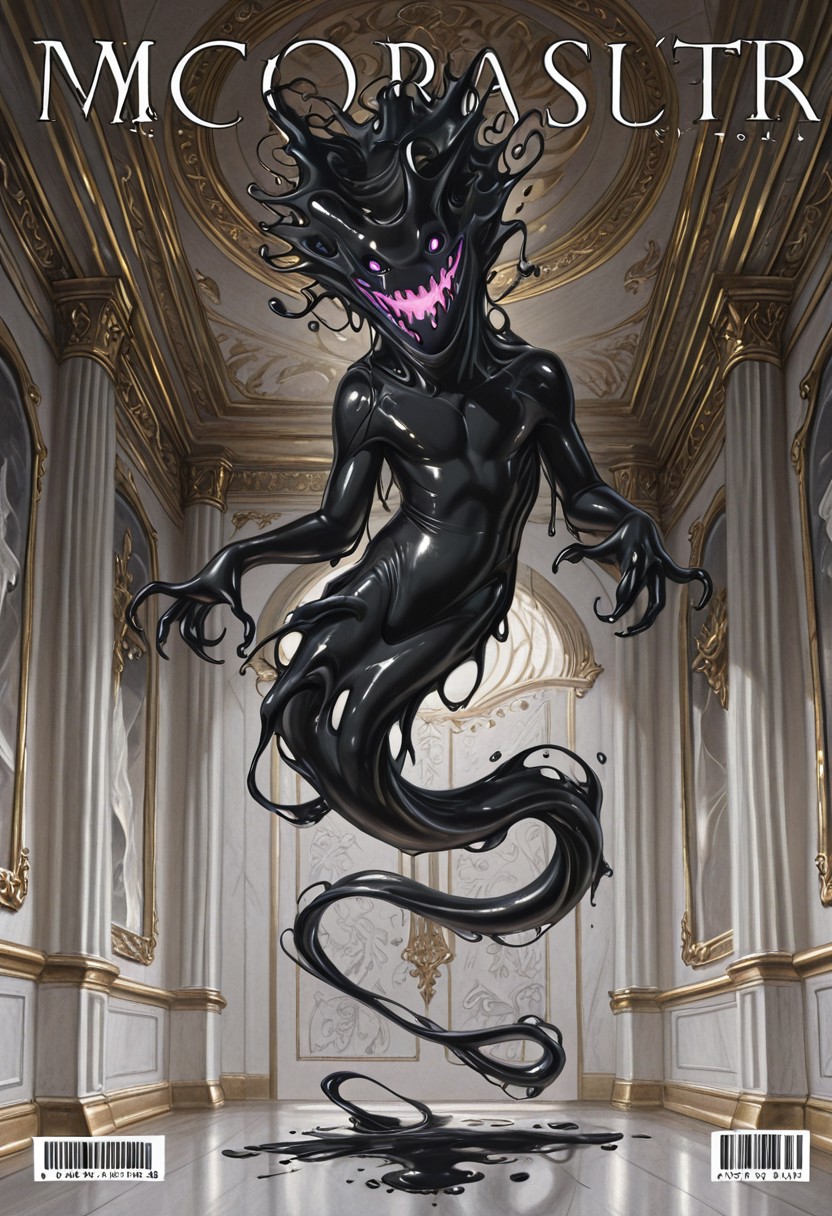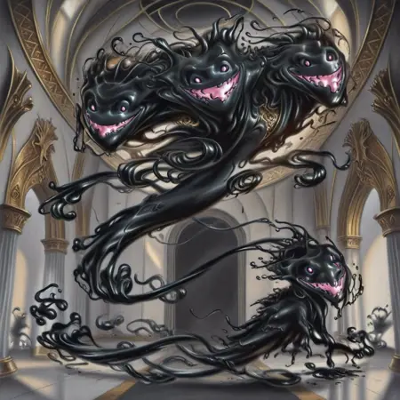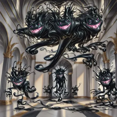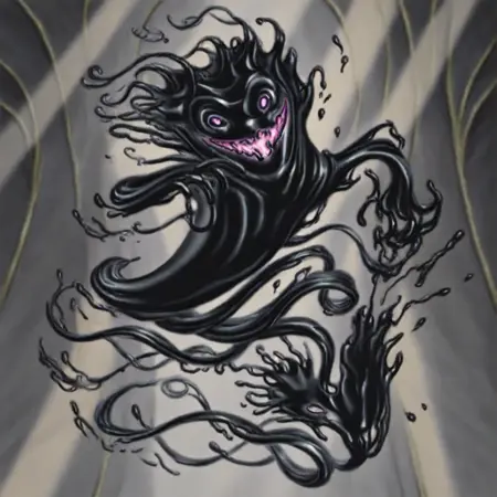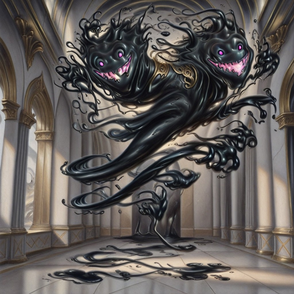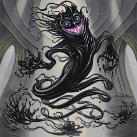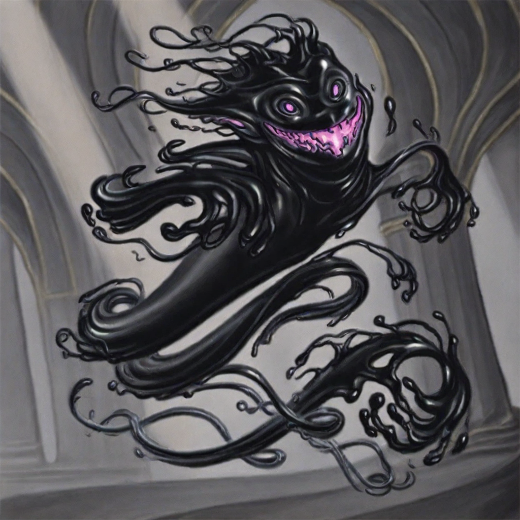 MTGinkling, black ink monster, black liquid body, incorporeal body, glowing purple eyes, glowing purple mouth, flying, floating,