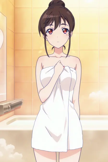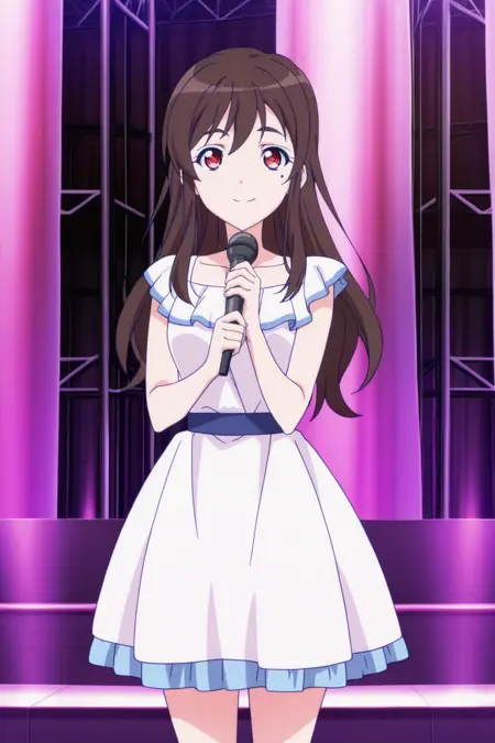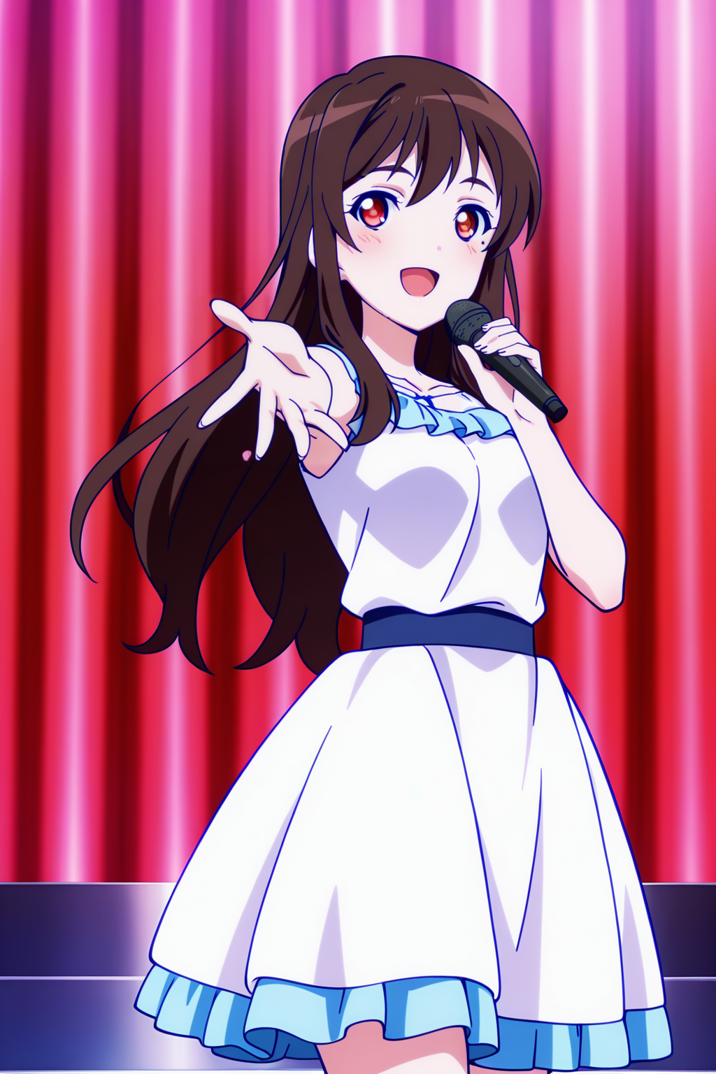 1girl, solo, hinashi koyuki, brown hair, long hair, hair down, red eyes, mole under eye, white dress, frilled dress, sleeveless, waist sash, blue sash