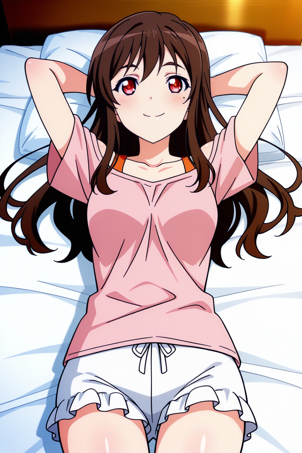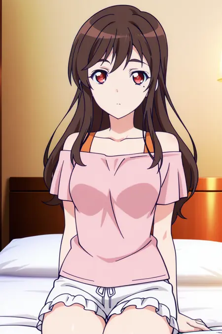 1girl, solo, hinashi koyuki, brown hair, long hair, hair down, red eyes, mole under eye, medium breasts, pink shirt, t-shirt, short sleeves, off-shoulder shirt, orange tank top, white shorts, frilled shorts