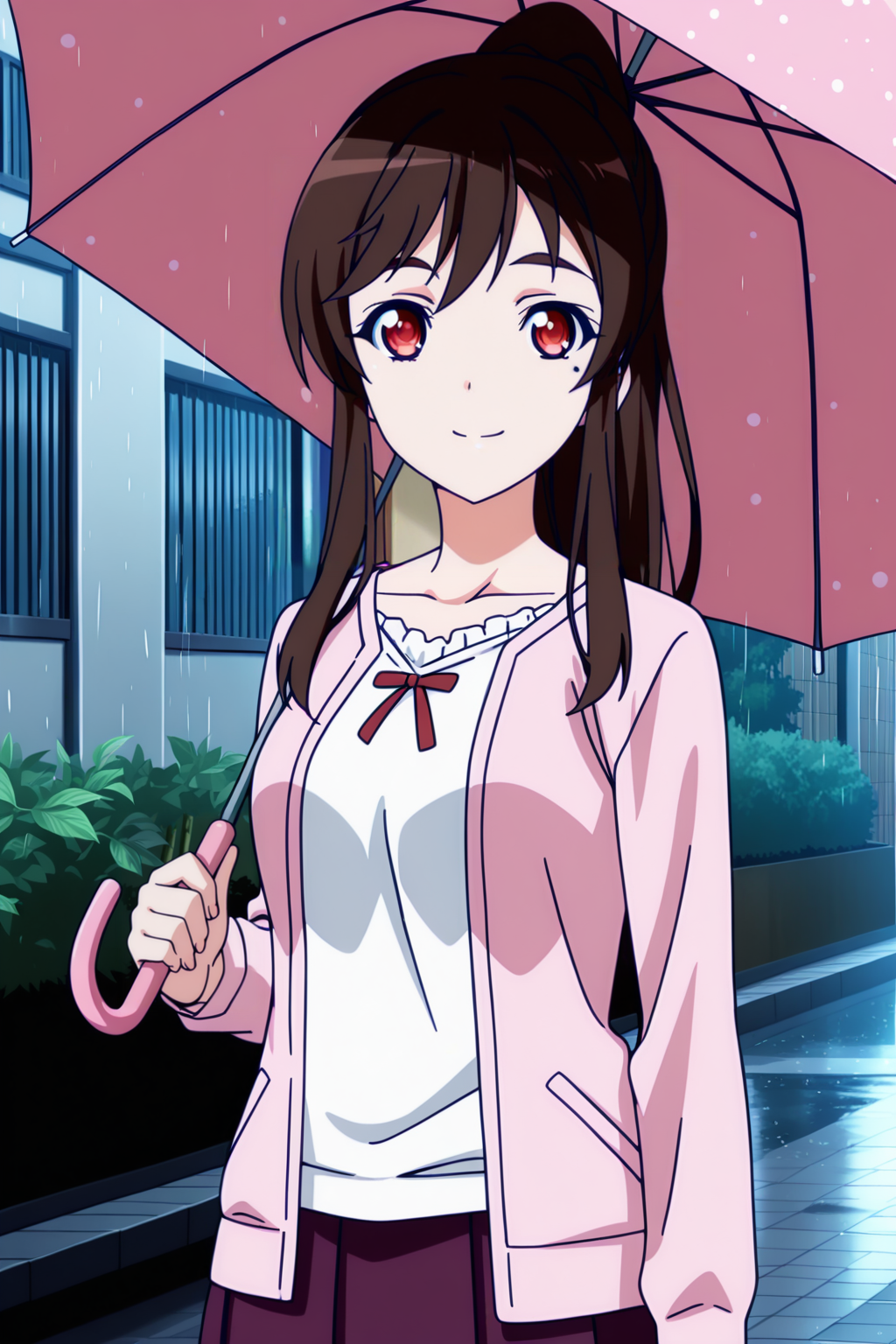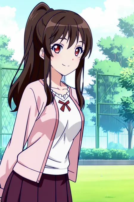 1girl, solo, hinashi koyuki, brown hair, long hair, ponytail, red eyes, mole under eye, medium breasts, pink jacket, open jacket, white shirt, frilled shirt, v-neck, shirt ribbon, red ribbon, long sleeves, purple skirt, pleated skirt, miniskirt