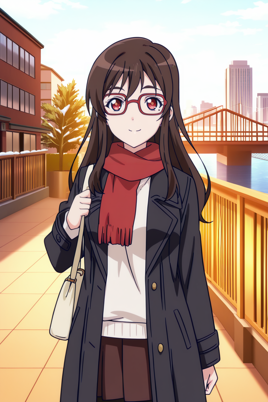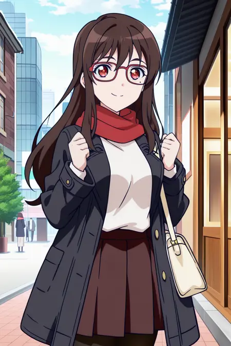 1girl, solo, hinashi koyuki, brown hair, long hair, hair down, red eyes, mole under eye, glasses, red-framed eyewear, medium breasts, black coat, open coat, white sweater, red scarf, turtleneck, long sleeves, brown skirt, pleated skirt, black pantyhose
