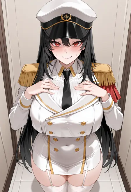 军帽,有领衬衫,条纹衬衫,白衬衫,黑色领带,军装,短夹克,白色夹克,肩章,双排扣,高腰裙,白裙,吊袜带,白色过膝袜,