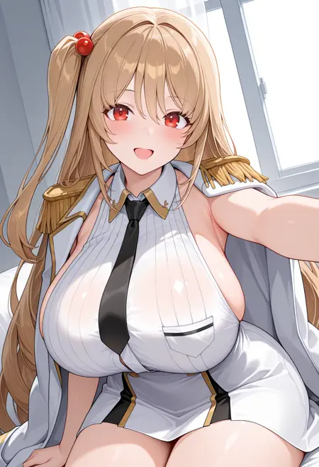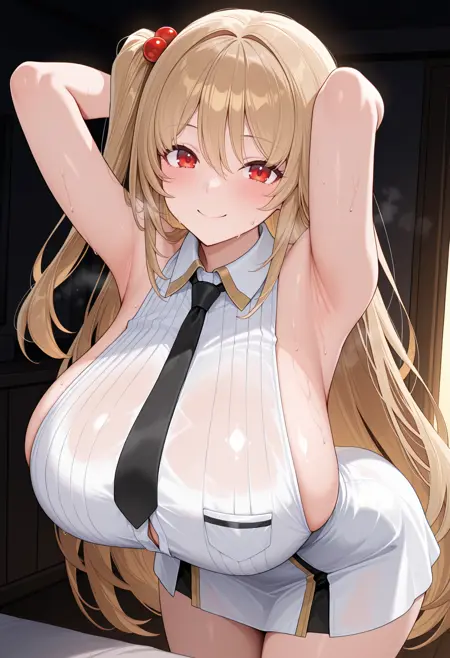 lsorsala, 금발, 갈색 머리, 매우 긴 머리, 붉은 눈, 한쪽을 위로 올린 헤어스타일, 거대한 가슴,