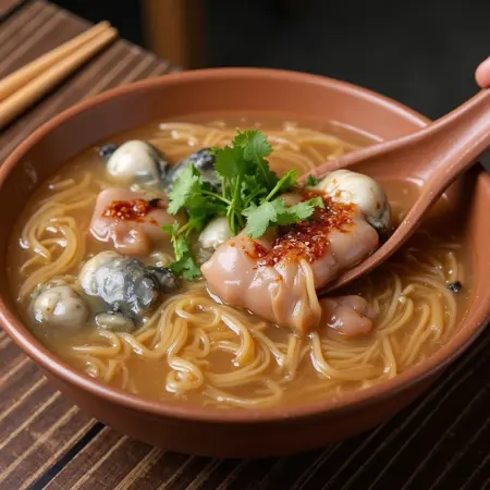 蚵仔米粉是台湾受欢迎的街头小吃。将细米粉煮在由鲣鱼高汤和淀粉制成的浓稠汤底中,再配上新鲜牡蛎和猪肠。口感顺滑、味道鲜美,通常淋上黑醋、蒜末和辣椒,增添风味。