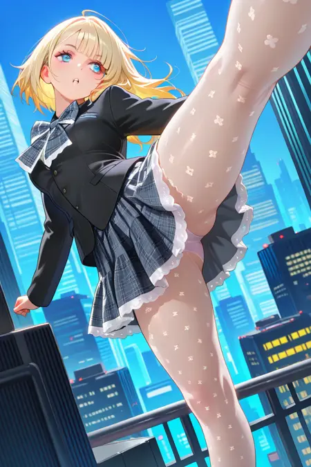 blackplaid_cos,plaid skirt,pleated skirt, print pantyhose,long sleeves ,plaid bowtie,grey bow,grey skirt,black_jacket,,lace-trimmed skirt