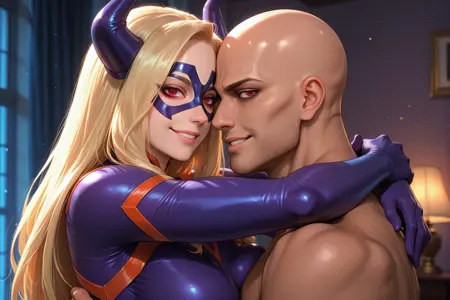 ilmount, 1girl, 1boy, hetero, sex, breasts, long hair, blonde hair, domino mask, sex from behind, large breasts, horns, ass, nipples, clothed female nude male, doggystyle, nude, mask, red eyes, open mouth, heart, muscular, top-down bottom-up, blush, sweat, thighhighs, ass grab, tongue, bodysuit, spoken heart, tongue out <lora:illustrious mount lady 1152x768:1>