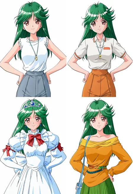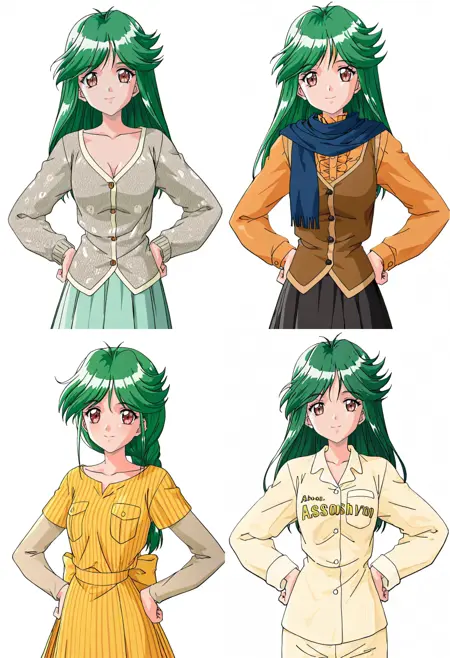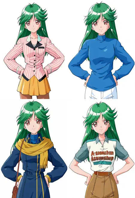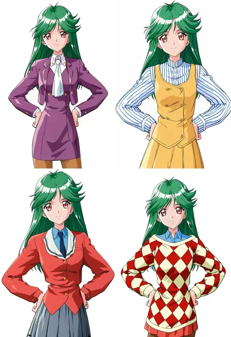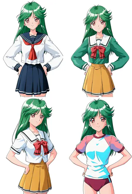 school uniform, loafers, long sleeves, pleated skirt, red bowtie, green shirt, white sailor collar, white socks, yellow skirt, white trim skirt