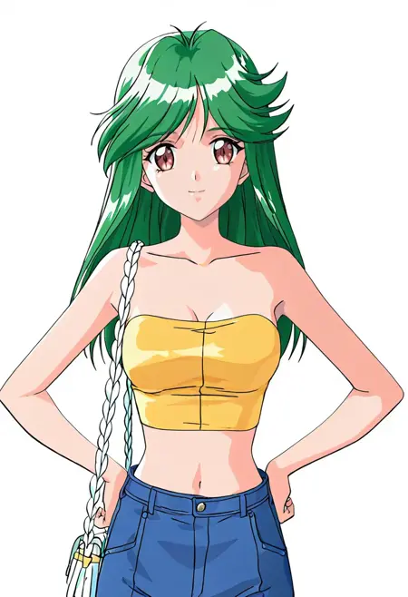yellow crop top, denim, bare shoulders, midriff, collarbone, white handbag, blue pants, jeans