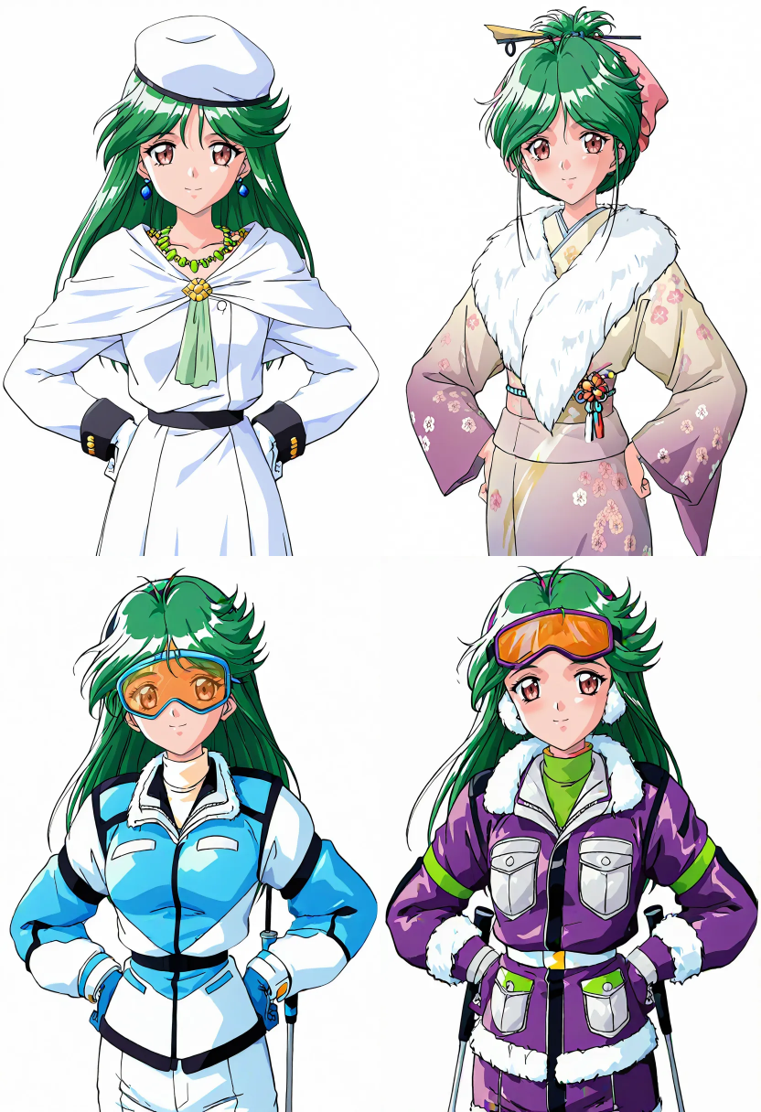 ski goggles, fur trim, goggles on head, purple gloves, white belt, pocket, winter clothes, long sleeves, ski gear,purple jacket, light green sweater, orange shirt, turtleneck, earmuffs, ski pole, multicolored clothes, white pocket, light green pocket, breast pocket, two-tone pocket, light green armband, two-tone gloves, white gloves