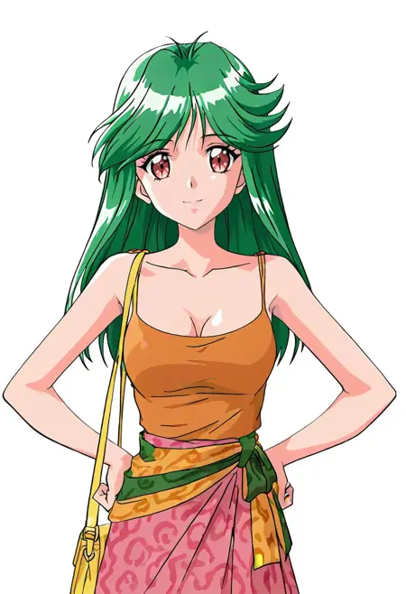 orange camisole, cleavage, collarbone, yellow handbag, pink skirt, multicolored sash, print skirt