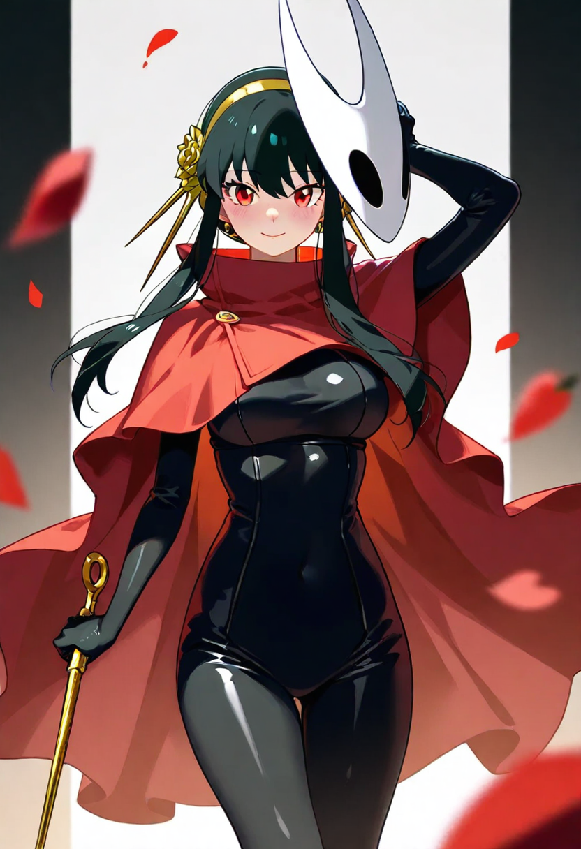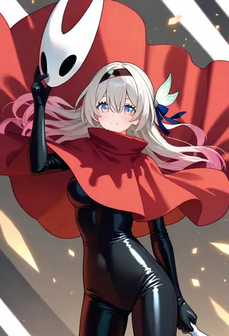 character,1girl,black bodysuit,hornet (hollow knight) (cosplay),mask on head,red cloak,white background,