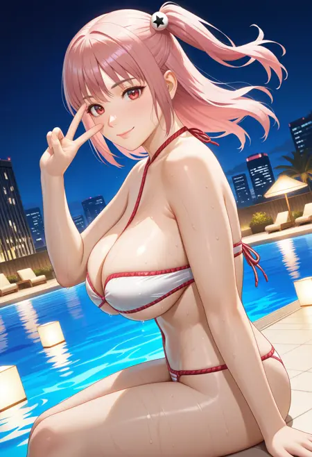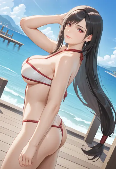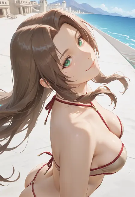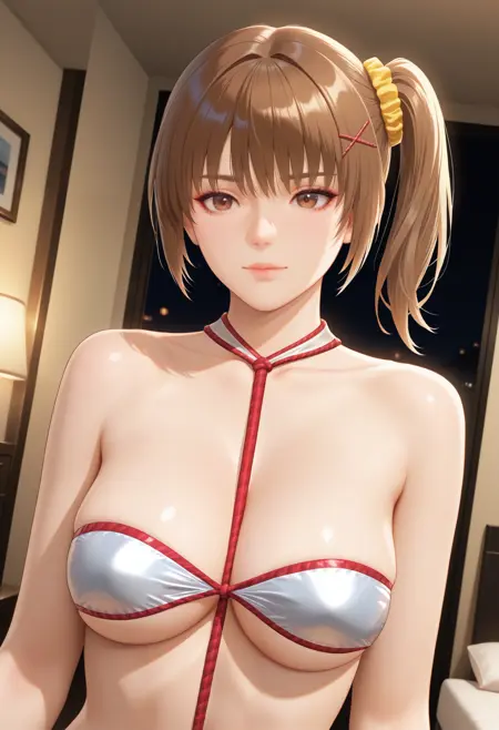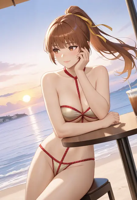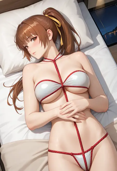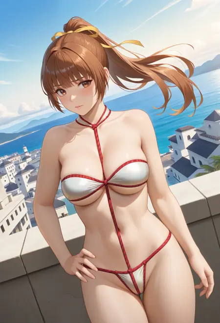 基本プロンプト:AnagoDoaxvv,strapless bikini,bondage-style bikini,halterneck,beige fabric,striped thong