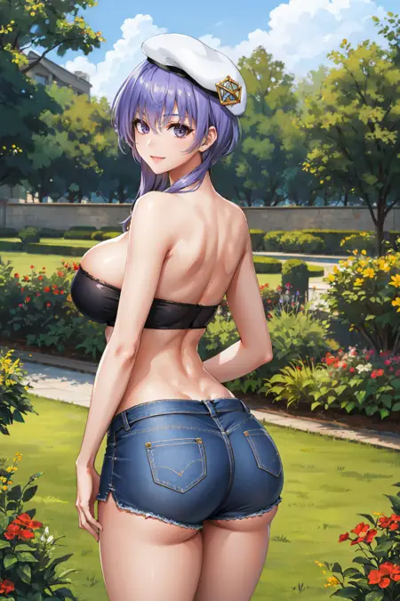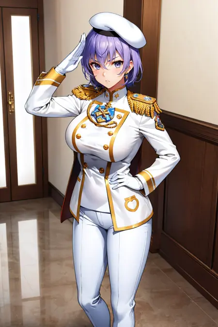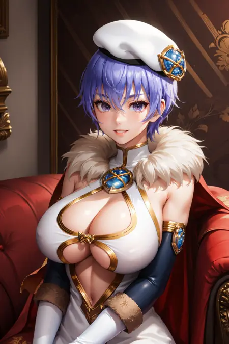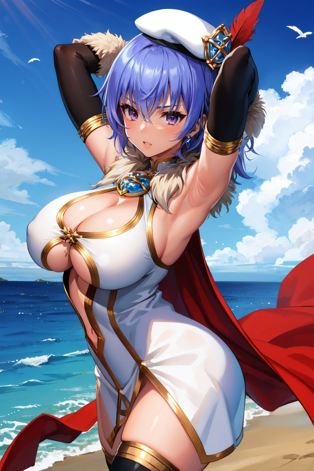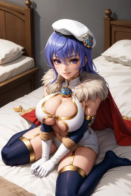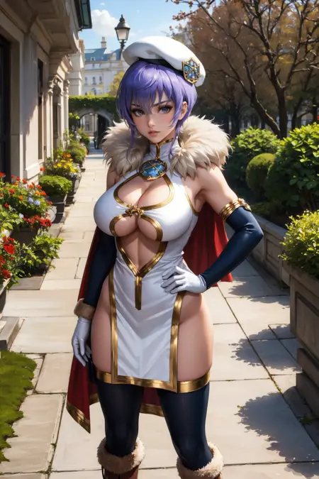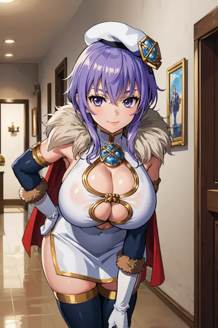 要呈现她的典型造型,请添加 "白色贝雷帽、毛皮镶边、白色连衣裙、红色斗篷、胸部切口、肘部手套、黑色过膝袜"。