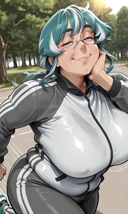 glasses, semi-rimless eyewear, black and white track suit, tight pants,