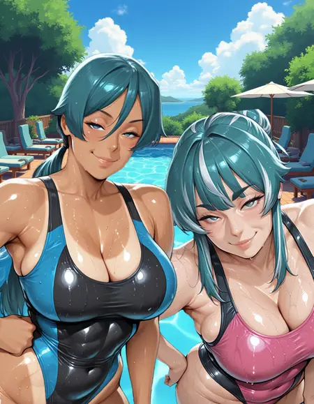 suimako, wrinkles, mature female, dark skin, dark-skinned female, muscular female, long hair, low ponytail, ponytail, aqua hair, hair between eyes, big breasts, tan, tanlines, big breasts,